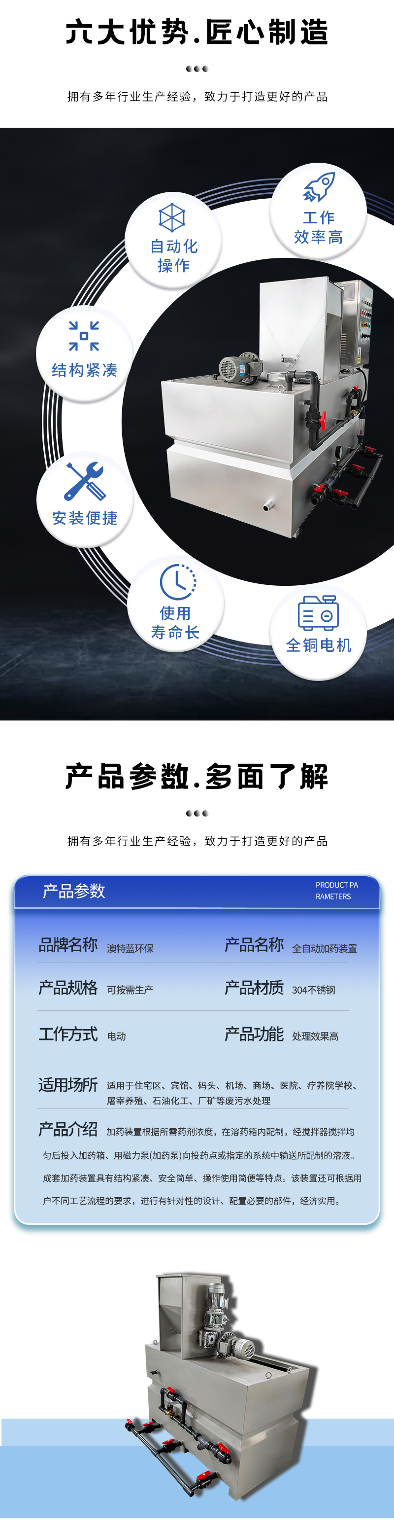 加藥裝置主要由溶液箱、攪拌器、計量泵、液位計、電控柜、管路、閥門、Y型過濾器等組成。加藥裝置根據(jù)所需藥劑濃度,在攪拌箱內(nèi)配置,經(jīng)攪拌器攪拌均勻后投入溶液箱、用計量泵向投藥點或指定系統(tǒng)中輸送所配制的溶液??筛鶕?jù)用戶不同工藝流程的要求,進行有針對性的設(shè)計、配置必要的部件,實現(xiàn)自動遠程控制等功能。