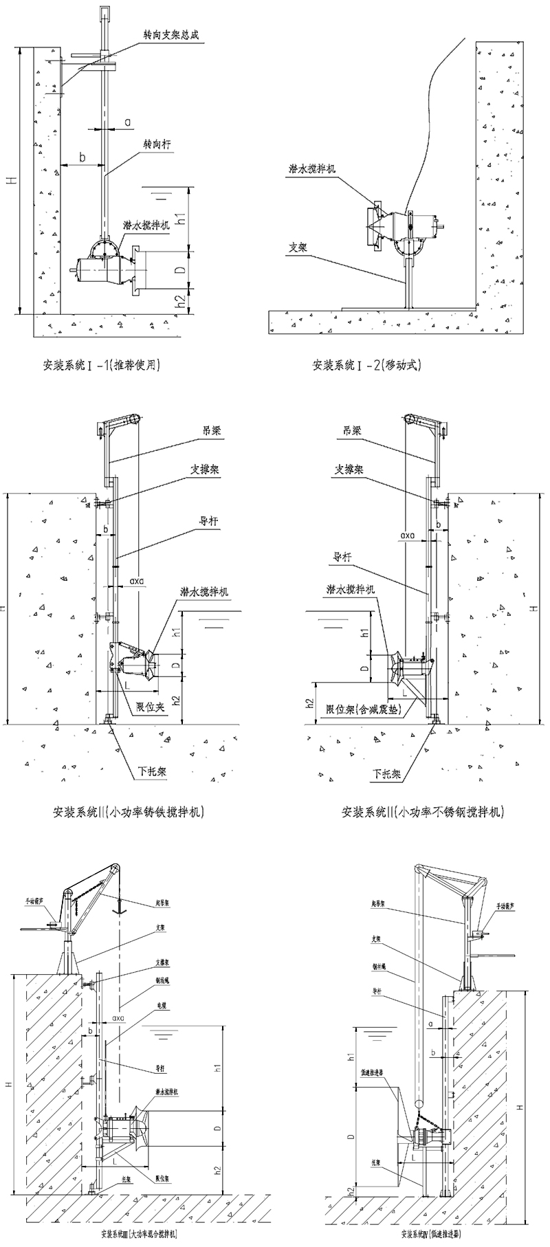 潛水?dāng)嚢铏C必需完全潛入水中工作;不能在易燃易爆或有強 腐蝕性液體的環(huán)境中工作;鋼膨脹螺栓須按要求固定,安裝完畢后,必須將電纜拉緊固定好。