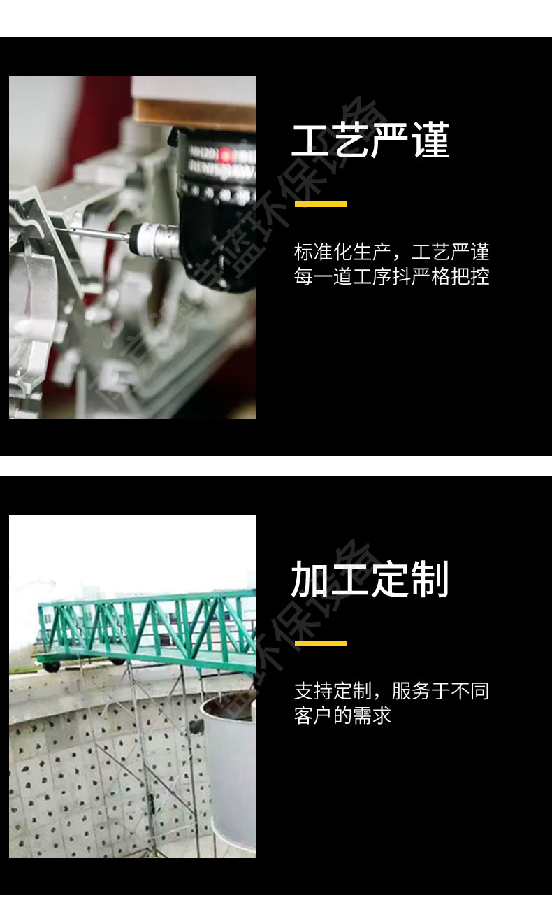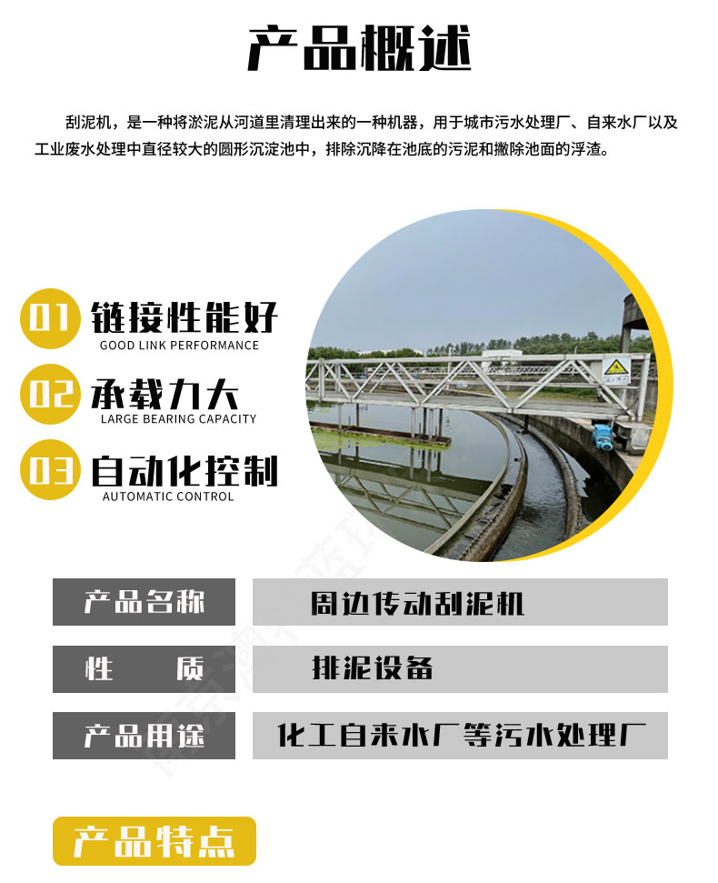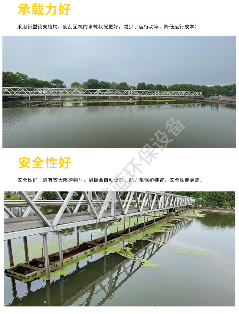 周邊傳動半橋式吸泥機ZBXN 用途: ZBXN 型吸泥機用于污水處理廠圓形二沉池,將沉降在池底的污泥刮集至一組沿半徑方向布置的管口,再通過中心排泥管排出,以便污泥回流或濃縮脫水,同時將池面的浮渣撇向集渣斗,通過集渣池外,以便進一步處理。