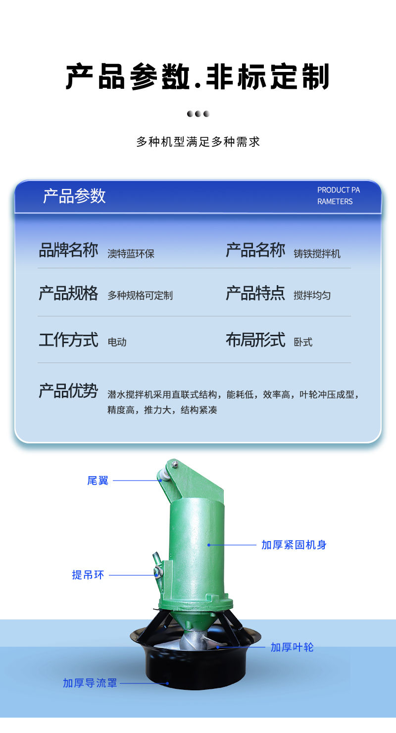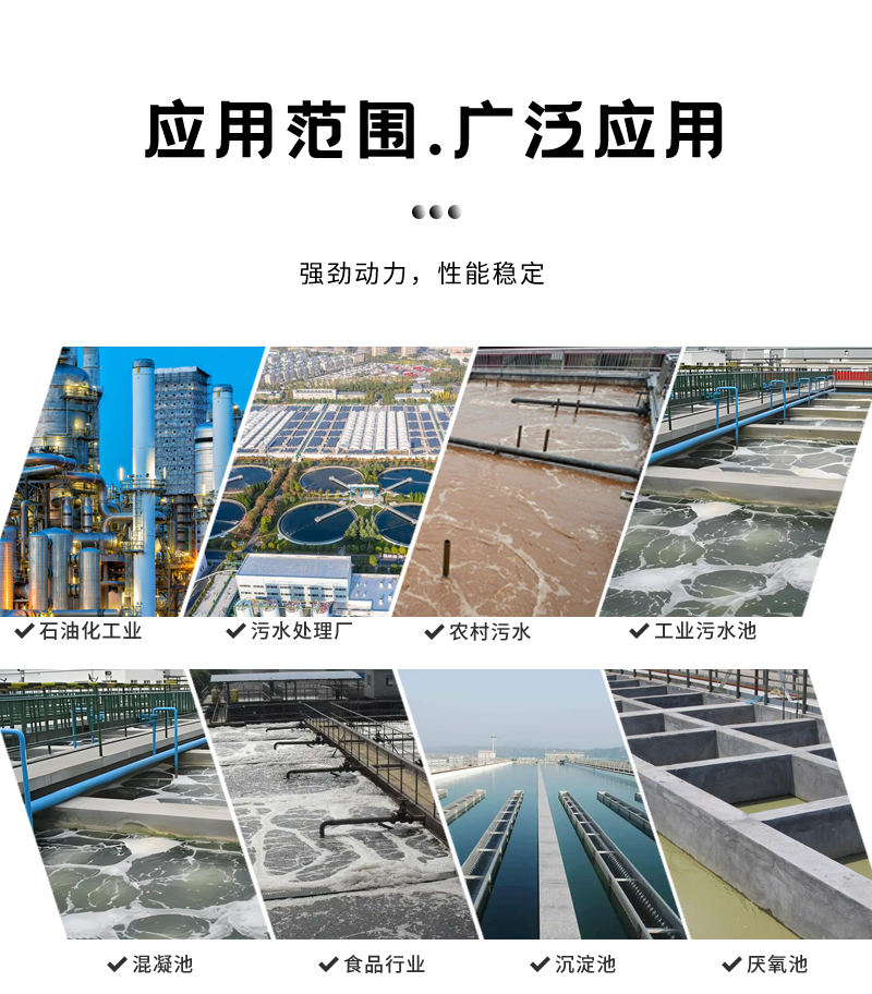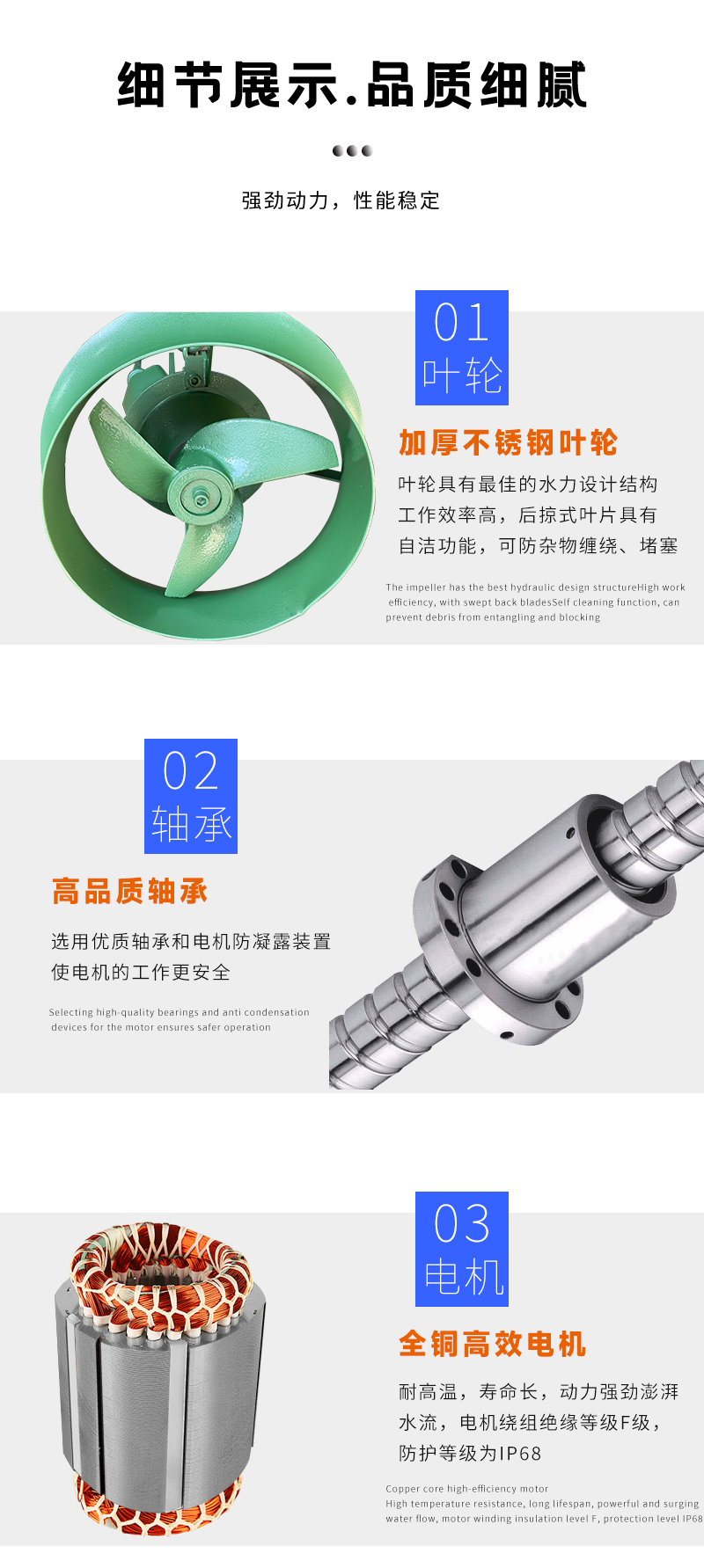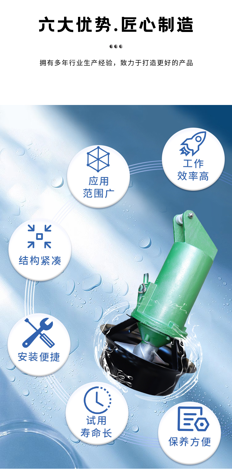 葉輪具有很好的水力設計結構,工作效率高,后掠式葉片具有自潔功能,可防雜物纏繞、堵塞; 電機繞組絕緣等級F級,防護等級IP68,選用NSK軸承和電機防凝露裝置,使電機的工作安全;